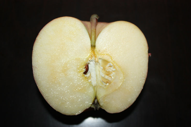 “沂源红”树冠紧凑,枝条节间平均长54.75px,比长富2号短,比宫崎短枝略长,具有典型的短枝型特征。果实长圆形,平均单果重335.2克,果形指数达0.87-0.91,果实条红,色泽艳丽,全红果比例达到85%以上;果肉黄白色,细脆多汁,可溶性固形物含量达15.7%,果实硬度8.2-9.1 kg/cm2,风味香甜,品质上等,10月中下旬成熟,果实发育期185天左右。